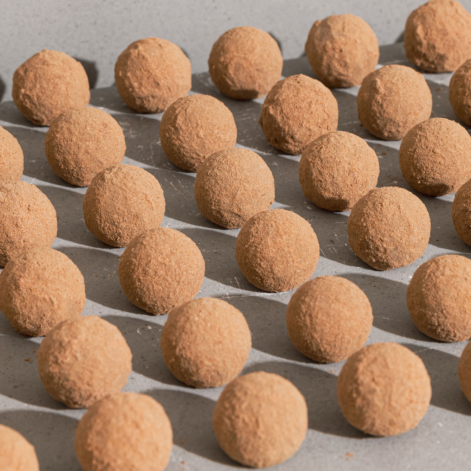 Schokoladenpralinen gefüllt mit Karamellcreme und gewälzt in Salzlakritzpulver